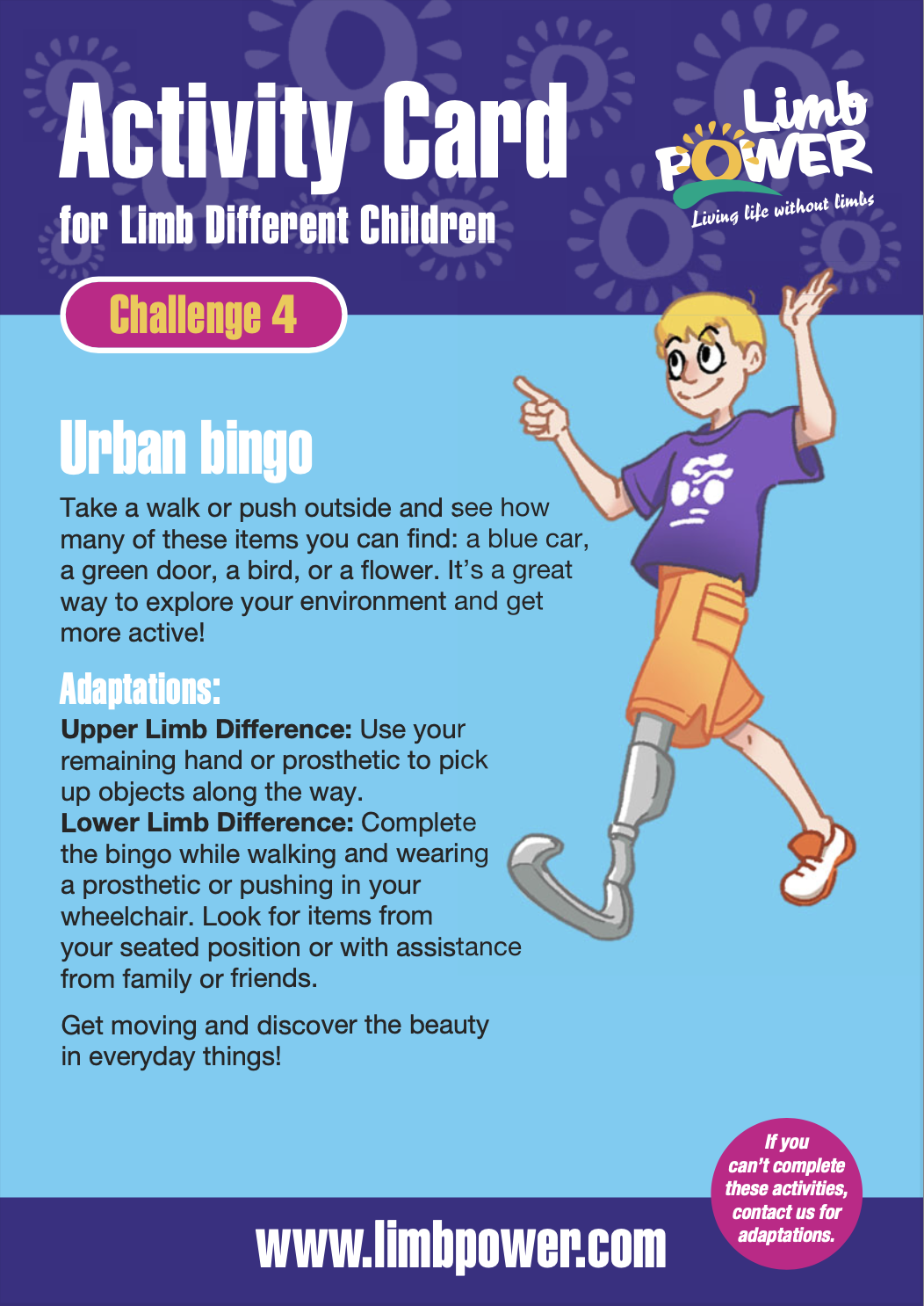 Welcome to our pack of 31 Activity Cards for children with an amputation or limb differene. There are 31 Challenges, one for each day of the month to encourgae children to stay active. The challenges have been adapted for children with both upper and lower limb difference. Please read the disclaimer before trying these challenges.
