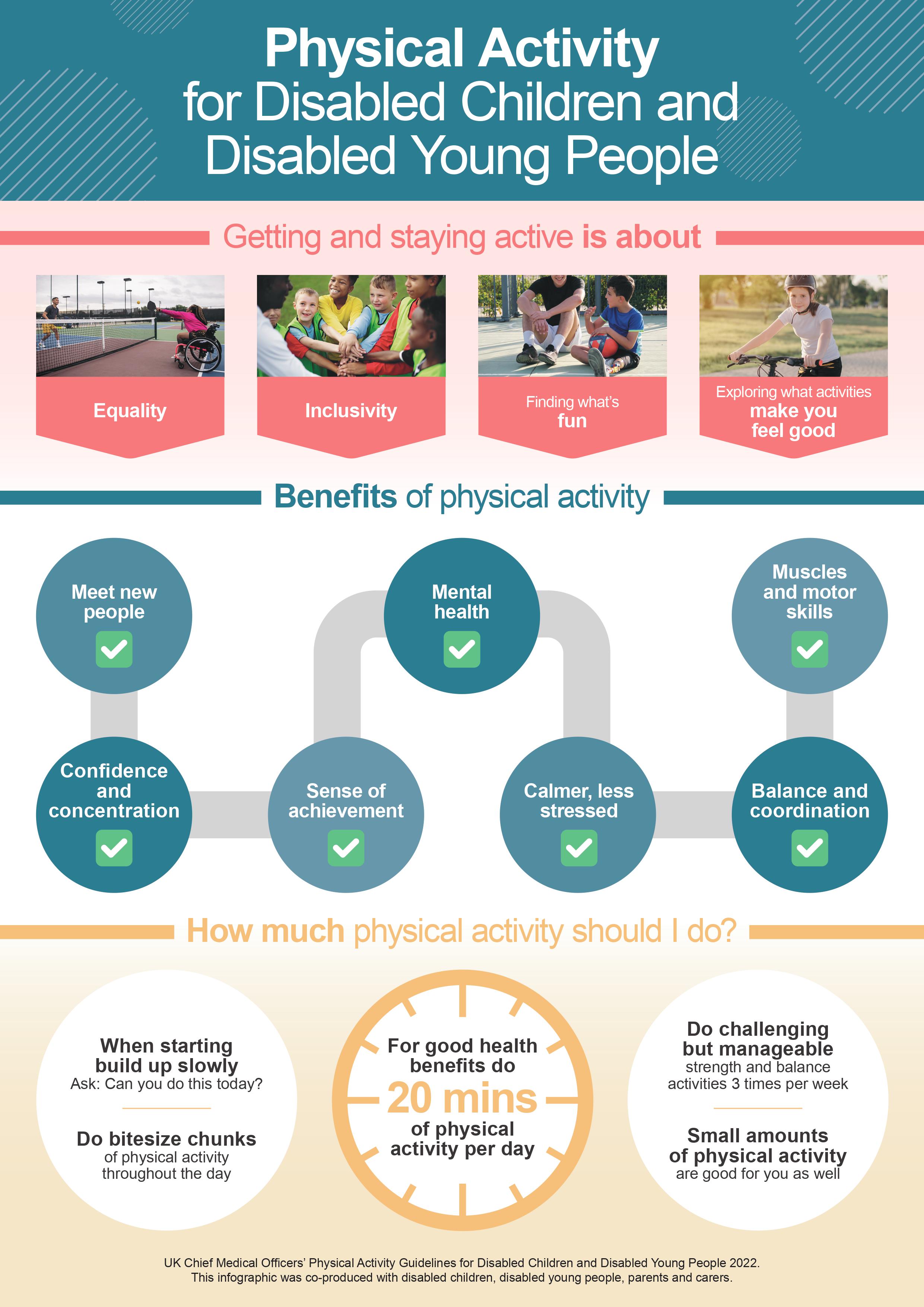 New guidelines to support disabled children and young people to be more active Guidelines advise 20 minutes of exercise per day and strength and balance activity 3 times a week Supports wider work to tackle health disparities across the UK helping everyone lead healthier, happier lives.