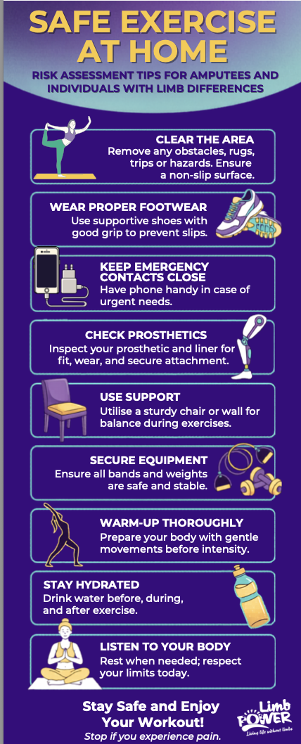 This visual guide provides practical safety tips to help amputees and individuals with limb difference exercise safely at home. It highlights simple risk‑reduction steps such as clearing exercise spaces, wearing appropriate footwear, checking prosthetics and liners, securing equipment, using support for balance, and keeping emergency contacts nearby. The resource also reinforces the importance of warming up, staying hydrated, and listening to your body to reduce the risk of injury. Designed as an easy-to-follow checklist, it supports confident, independent participation in home‑based exercise.