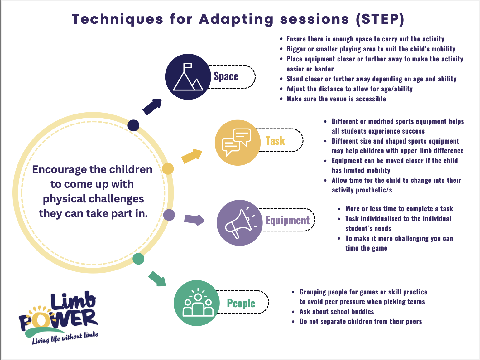 Techniques coaches can use to adapt the STEP model for children with an amputation or limb difference.